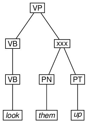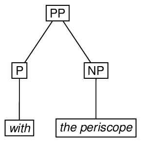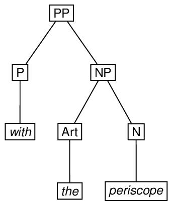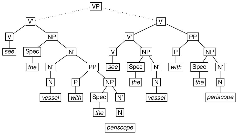 Depending on the grammar one uses to associate structures with examples like see the man with the periscope, the representations may be more complicated than this. For example, adopting a version of the X-bar theory of phrase structure originated by Jackendoff,90 the attachment of a modifier may require the creation of an intermediate node which is not required when the attachment is not made, as shown in the following diagram. A possible encoding of this ambiguous structure immediately follows the diagram.