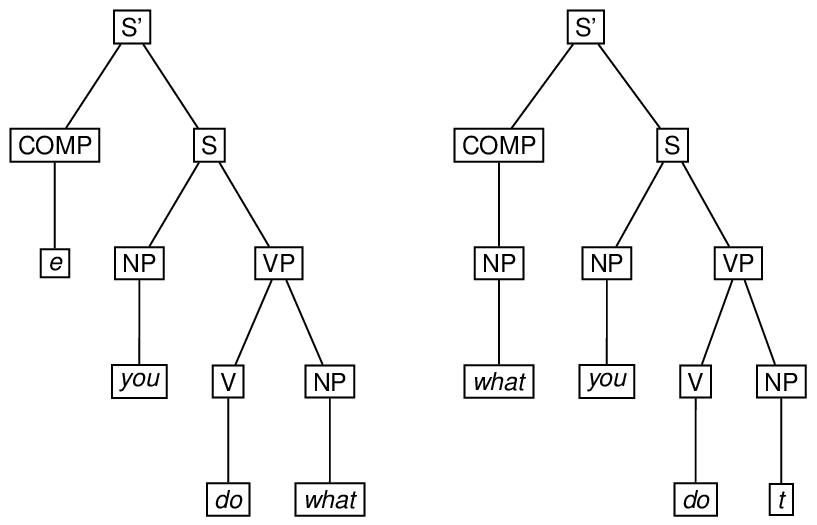 e and t denote special theoretical constructs (empty category and trace respectively), which need not concern us here.